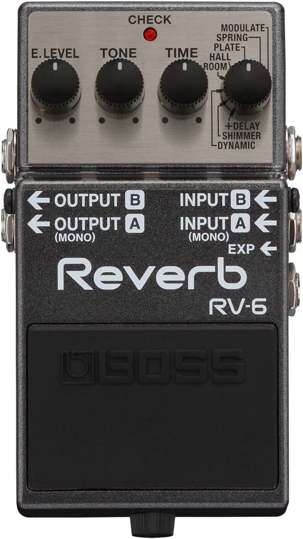 The Boss RV-6 Reverb Effects Pedal Combining high-end sound and wide-ranging versatility, the RV-6 takes pedal-based reverb to the next level. Reaching beyond the capabilities of previous generations, this powerful stomp employs the latest tech and legendary BOSS know-how to make it easy to get amazing reverb tones instantly. From subtle rooms to modern shimmer effects to long, evocative reverbs, the RV-6 envelops your tone in lush ambient spaces that endlessly inspire.